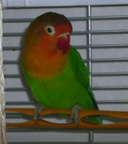 Paisley is a Fisher’s Lovebird (Agapornis fischeri). He showed up at our house in April of 2017. After hanging around for about two weeks eating the bird feed I put out for the wild birds, I decided to try and catch this bird. I didn’t think it would be safe for long with all the cats, hawks and other predators we have around here. The bird was fairly easy to catch once I decided how to go about it. It took about two weeks after we captured him for him to tell us his name was Paisley. It fits his colorful appearance and happy carefree personality |