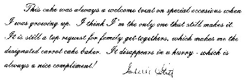 Beat sugar, oil eggs and vanilla together until light. Sift together flour, cinnamon, salt, baking powder and soda. Slowly add to the above mixture till blended. Mix together the grated carrots, pineapple and chopped walnuts, and fold into batter. Bake in 3 9 inch layer pans or 2 7 X 11 inch pans for 40 to 50 minutes at 350 degrees. You can also add raisins (soak in warm water first, drain well and dry with paper towel)