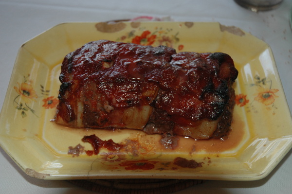 Pour sauce over loaf and bake at 350 degrees for 1 hour.