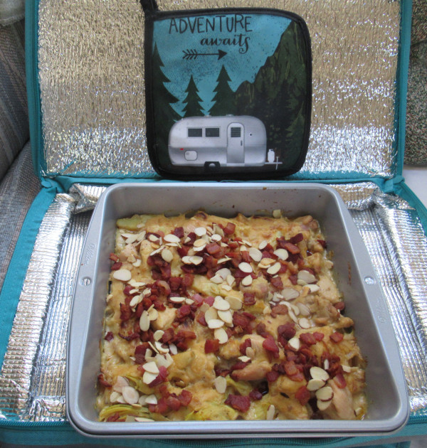Heat butter in saute pan; put in chicken. Sprinkle with salt and pepper; brown on both sides. Put into a casserole with drained artichokes. Add onion and paprika to remaining fat; saute until onion is soft. Remove from heat; stir in flour. Return to heat and cook 1 minute. Gradually add water in which bouillon cube has been dissolved; stir until boiling. Remove from heat; add sour cream and wine. Reheat a few minutes without boiling. Pour over chicken. Cover; cook about 1 hour. Before serving sprinkle with bacon and almonds. Yield 4 servings.