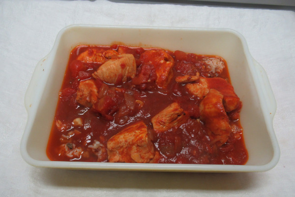 KampamaIn large skillet brown chicken on all sides in butter and olive oil; remove from pan. Brown onions and garlic. Add tomatoes, tomato paste, seasonings, and wine; bring to a boil. Add chicken. Reduce heat to simmer; cook 1 to 1 1/2 hours or until tender. Yield 4 to 5 servings.
