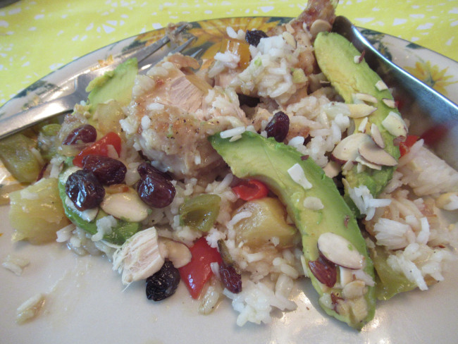 iane LeipperDust chicken with flour mixed with salt; brown in hot shortening until crisp on all sides. Remove to casserole. Add green pepper, garlic, and onion to pan; cook until soft, then push to one side; add pineapple, brown in pan drippings. Sprinkle 2 tablespoons of the flour-salt mixture over the onion; stir until blended, then stir in the wine; add raisins, chili pepper, and water. Pour mixture over chicken in casserole, cover. Simmer gently or bake at moderate heat until chicken is very tender - about 2 hours. Serve with hot cooked rice and garnish with almonds and avocados.