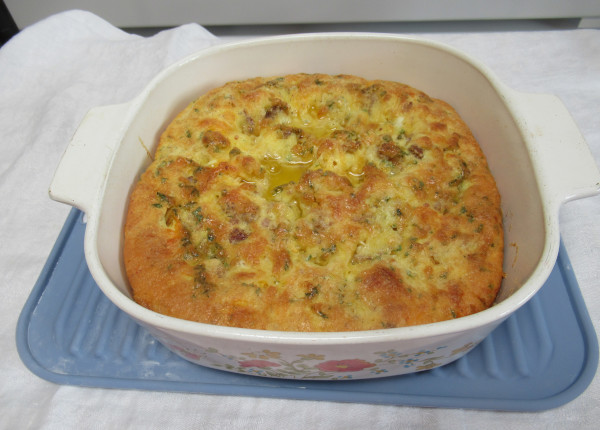 Melt cup of margarine and pour half into a 13 X 9 X 2 Pyrex. Spread cheese evenly in pan. Lightly beat eggs with half & half and seasonings. Pour over cheese. Drizzle rest of melted margarine over and bake at 325 degrees for 40 - 45 minutes or until set. Serves six