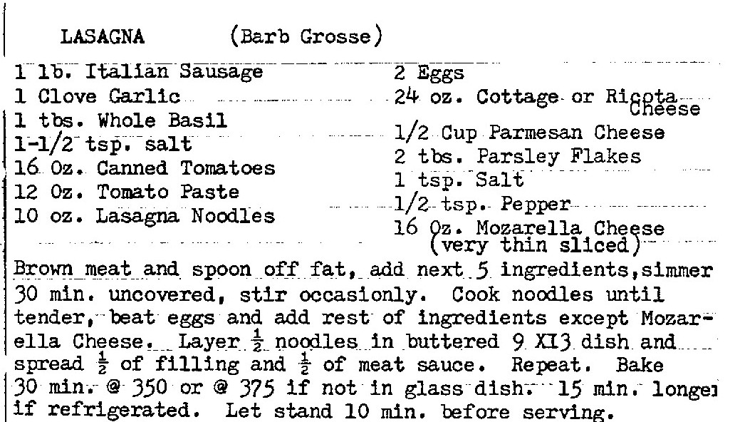I usually use the recipe as a base line only, adding ingredients and increasing amounts as it suits me. I sometimes add tofu to the ricotta cheese in the lasagna. I also add tofu to other recipes including soups, stews, meatloaf, tamale pie, etc. - DLL Lasagna freezes well so I like to make a lot (usually double the recipe), divide up, and freeze for later meals. - DLL