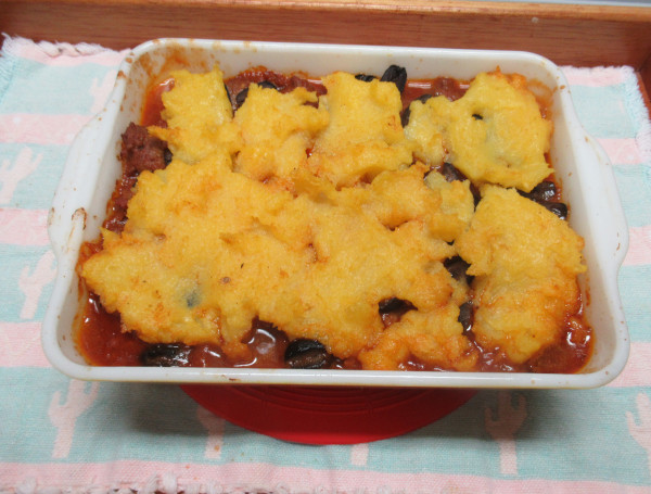 Grease a flat pan and add part of the mush. Pour in the meat mixture, add the olives and either cover with the remaining mush or add the mush in large spoonfuls onto meat mixture. Bake at 350 degrees for 30 minutes.