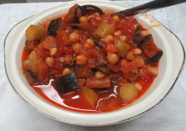 Place in a large heavy saucepan with fried eggplant. Cover. Bring to a boil over high heat. Reduce heat to medium low. Simmer 15 to 20 minutes until potatoes are just tender. Add garbanzos