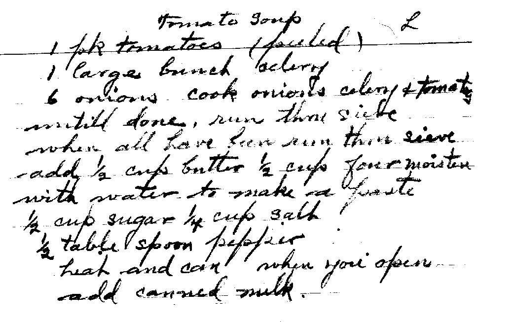 SoupCook onions, celery and tomatoes until done. Run through a sieve. When all have been run through sieve, add 1/2 cup butter, 1/2 cup flour, moisten with water to make paste. Add 1/2 cup sugar 1/4 cup salt, 1/2 Tablespoon pepper. Heat and can. When you open, add canned milk.