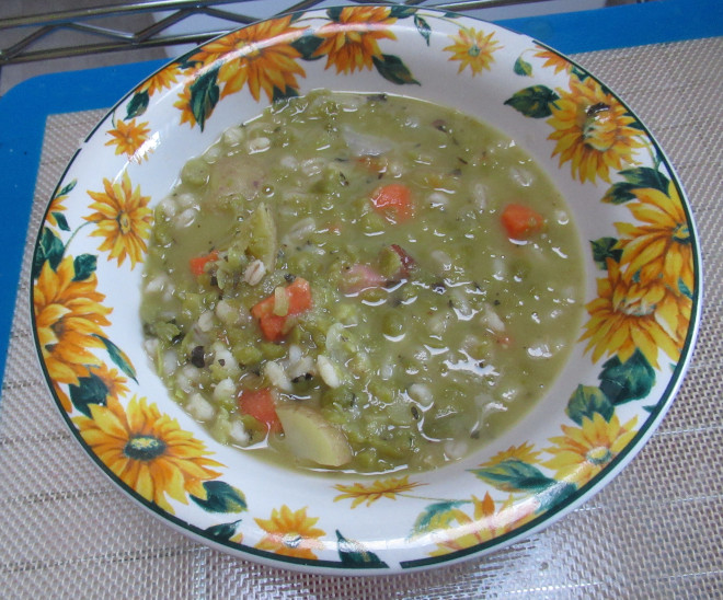 Pea SoupSaute onion in oil until soft, along with bay leaf and celery seed. Stir in peas, barley, and limas. Add 10 cups cold water and bring to a boil. Cook on low heat, covered, for about 1 hour. Add salt, pepper, vegetables, and herbs. Turn heat down as low as possible and simmer another 30 to 45 minutes. Thin with additional water or stock if necessary. Makes about 8 to 9 cups.