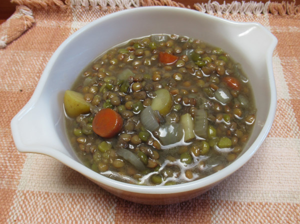 Mix all ingredients except vinegar in soup pot (or crock pot) and cook on low heat until lentils are very soft, about one hour. Add vinegar at the end and serve. Makes about 8 cups.